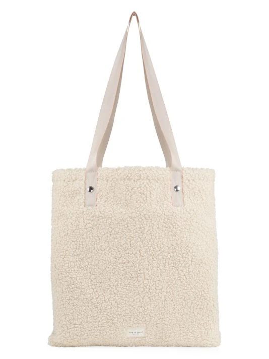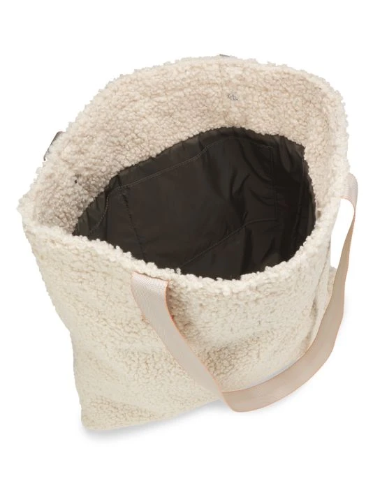 Luscious teddy tote featuring a spacious interior and logo patch at front.