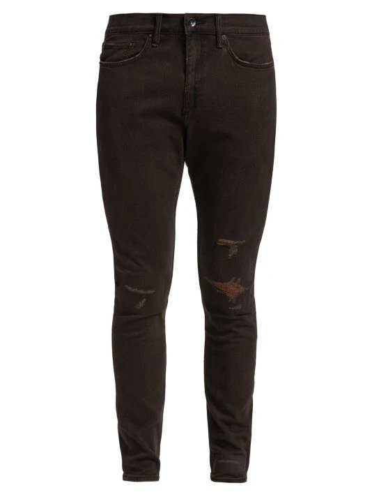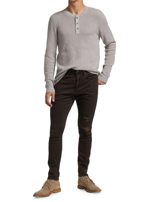 These distressed jeans feature classic details like belt loops, a zip fly with button closure, and a five-pocket style.