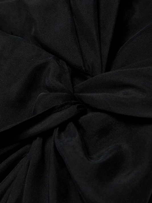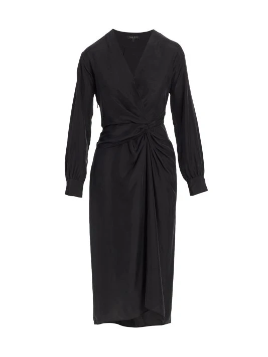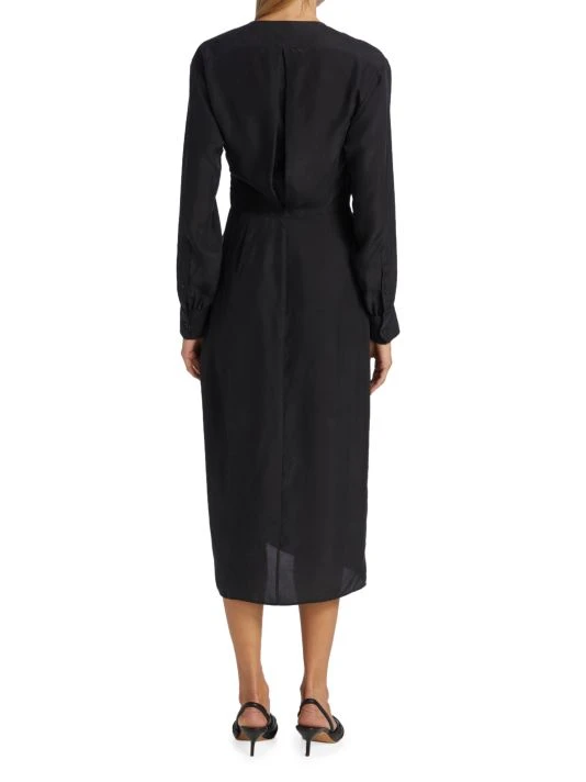 This dynamic midi dress crafted of sleek silk breaks tailored structure with twisted detail at the waist carried out in gathering in the skirt.