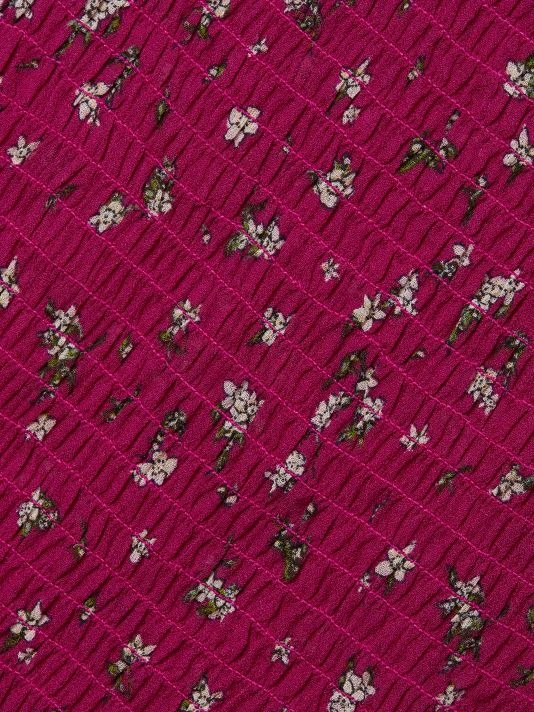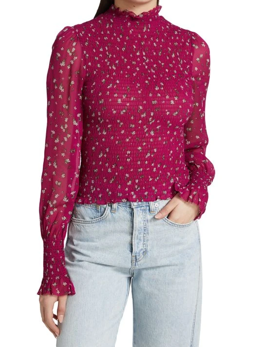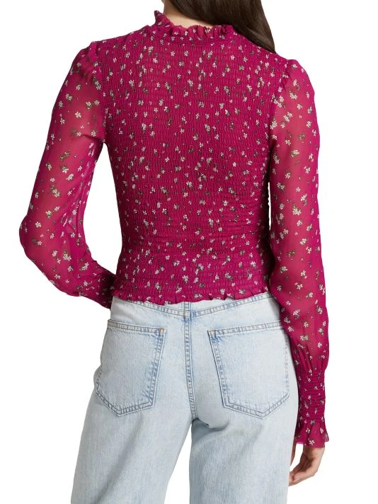 This charming smocked blouse blooms with a bright floral print finished with the ruffled neck.