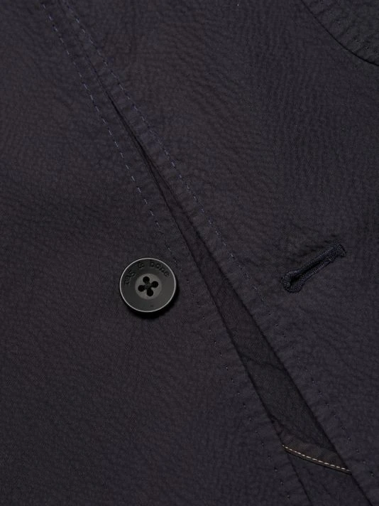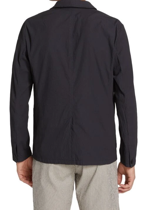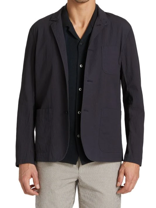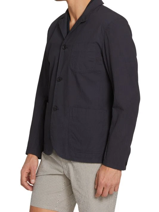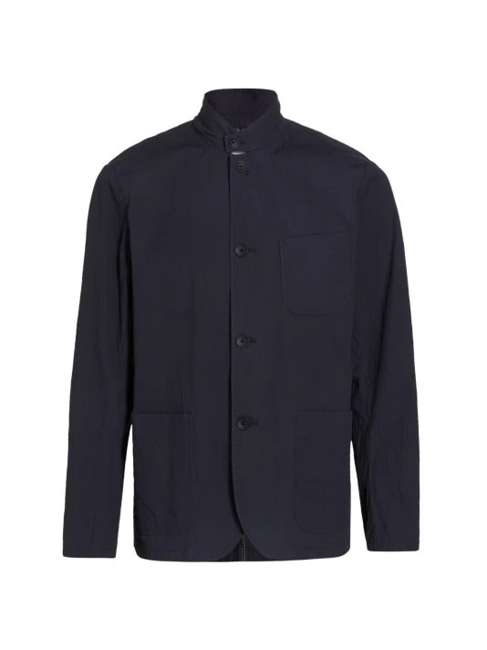 Crafted of lightweight stretch cotton, this seersucker blazer is styled with a buttoned mock turtleneck and patch pockets.