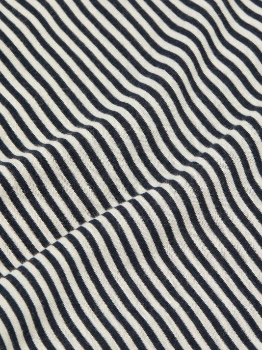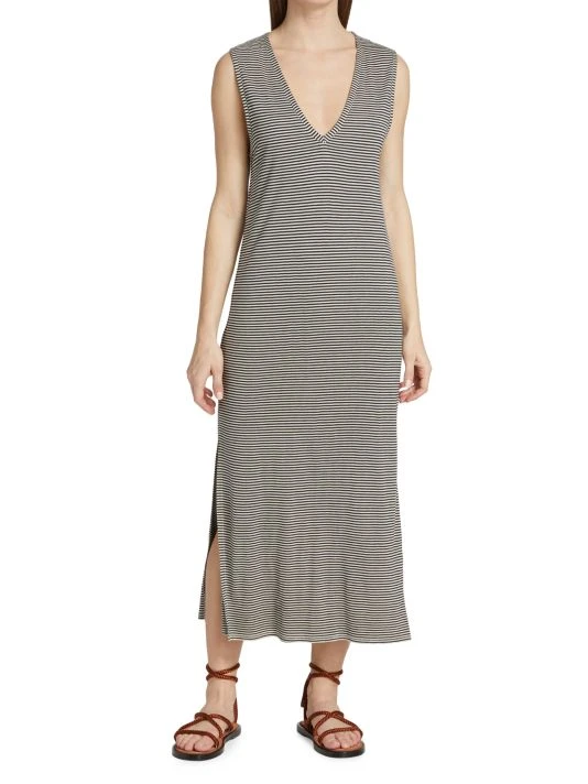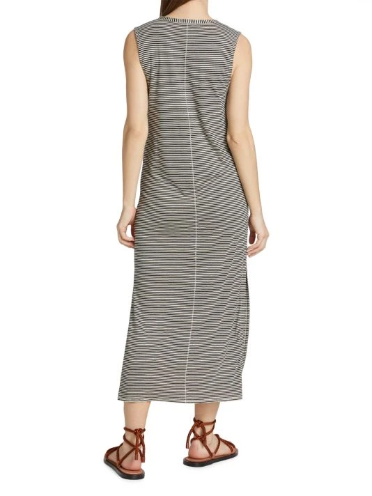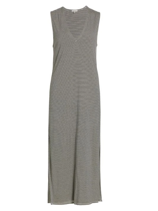 The sleeveless Michal midi-dress by New York’s rag & bone features a horizontal striped pattern and high slits at the side.