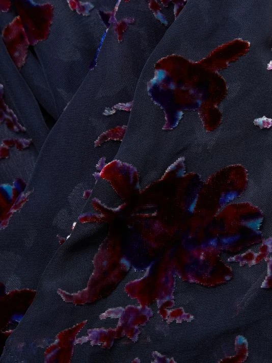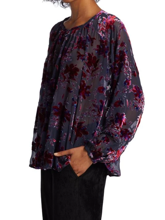 This blouse is decorated with faded velvet floral details over sheer fabrication.